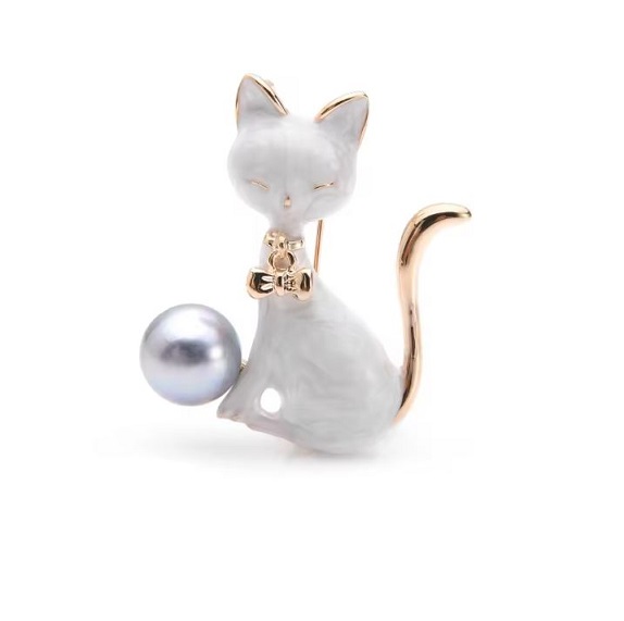 Description : jolie broche motif chat en métal couleur dorée. Le chat est blanc. Il est représenté assis avec une perle d'imitation blanche à ses pattes. On dirait qu'il joue avec une balle ou une pelote de laine. Il a une jolie petite tête. Dimension : 4,2 cm x 3,2 cm.